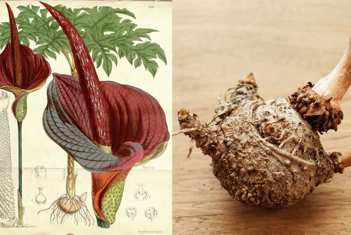 L'éponge Konjac est issue d'une plante asiatique appelée Konjac (Amorphophallus konjac), Originaire d'Asie du Sud-Est, cette éponge végétale est utilisée depuis des siècles pour ses propriétés nettoyantes et exfoliantes douces. C'est à partir du tubercule qu'on produit les éponges mais aussi les pâtes de Konjac consommées dans la cuisine asiatique ! .